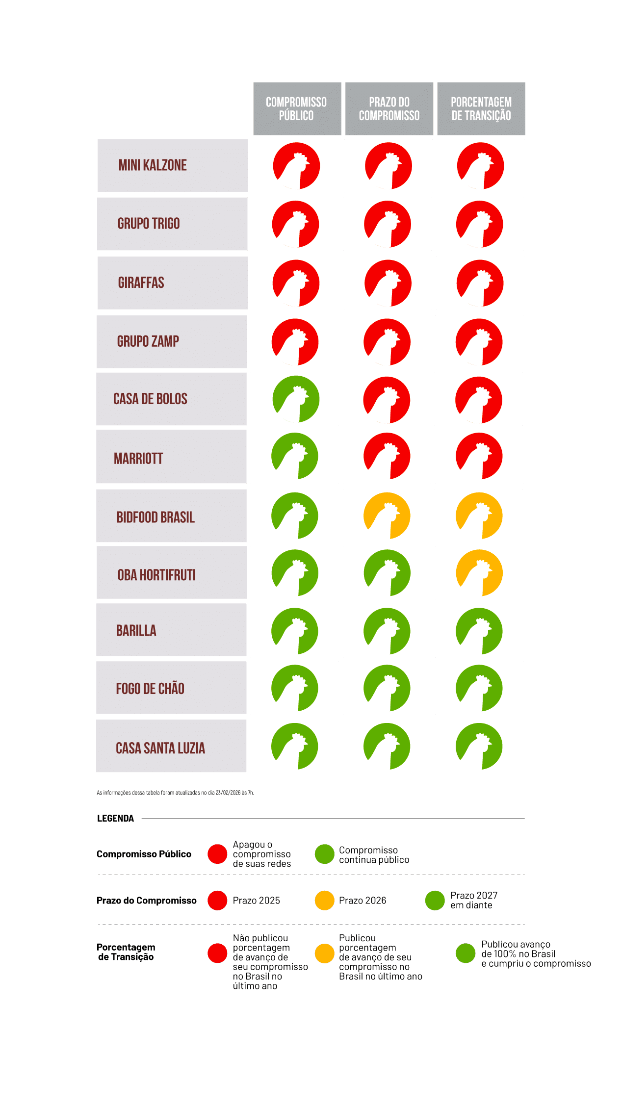 Só no Brasil, aproximadamente 200 empresas anunciaram políticas corporativas se comprometendo a deixar de usar em seus produtos ou vender ovos produzidos nessas condições. A maioria delas tem este ano, 2025, como o prazo para cumprir essa promessa que foi estabelecida há anos. O grande problema é que muitas delas não estão sendo transparentes em relação ao progresso deste compromisso no Brasil. E o prazo para conclusão da transição está se esgotando.
